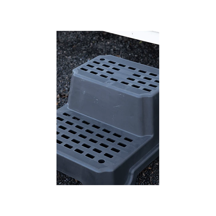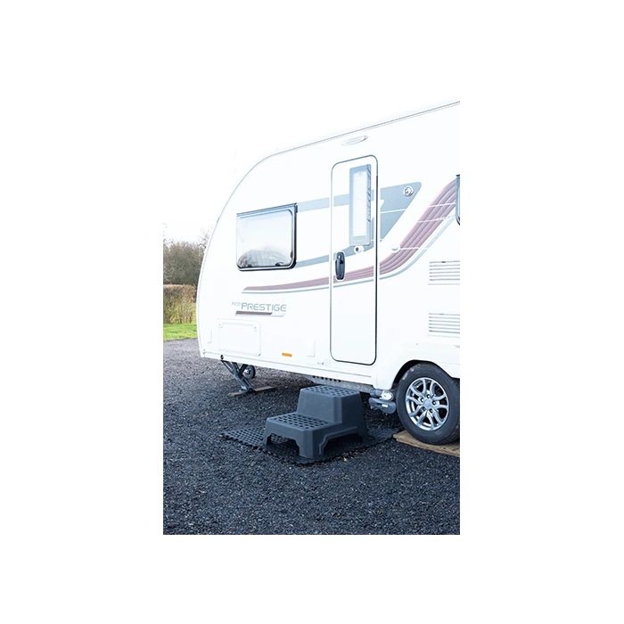 UV stable polypropylene plastic double step for caravans and motorhomes. Large anti slip tread size for maximum stability, taking up to a maximum of 150kg in weight. With large feet and peg holes for extra stability when used on grass.