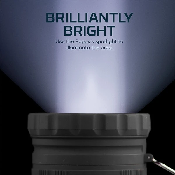 Poppyâ„¢ is a combination 300 lumen C.O.B LED lantern and bright LED spot light. Poppy is the perfect light for indoor or outdoor use when versatility and powerful lighting are critical. With a rubberized impact-resistant body, Poppy is both rugged and soft to the touch. Poppy easily changes from spot light to lantern with just a slide of its top, revealing a full 360 degrees C.O.B lantern. The handle easily adjusts to conveniently serve both light modes.